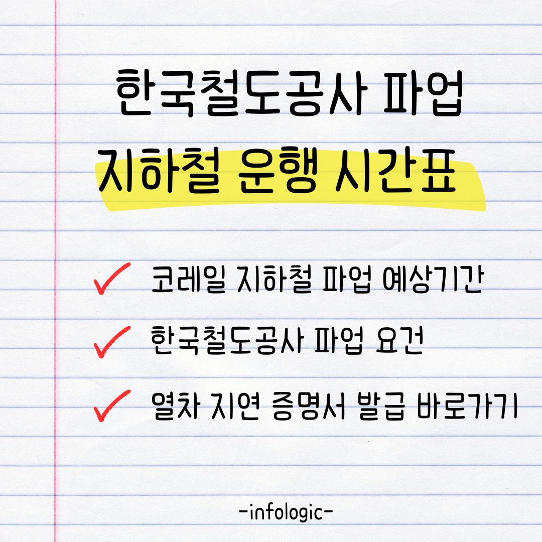한국철도공사에서는 지하철, 관광열차, KTX 등의 노선을 운행하고 있습니다. 노선별 파업 기간 운행 시간표에 대해 알아보겠습니다.