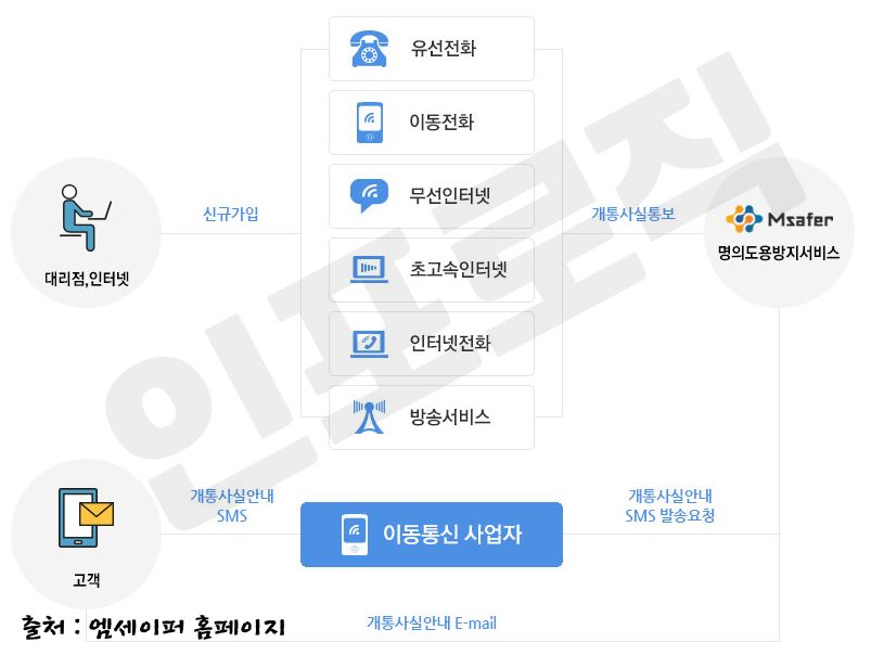 엠세이퍼는 내 명의로 유선전화, 이동전화, 무선인터넷, 초고속인터넷, 인터넷전화, 방송서비스 등을 신규가입하게 되면 대리점은 개통사실을 엠세이퍼에 통보해야 합니다.