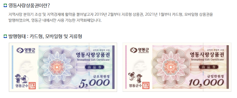영동사랑상품권충청북도 영동군이 발행하는 지역화폐입니다.