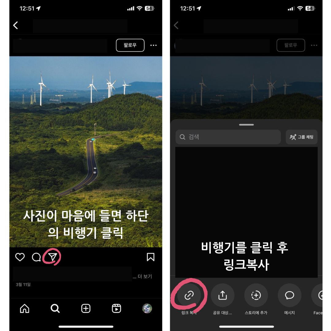 - 비행기 버튼을 누른 후 하단의 링크복사를 눌러 링크를 복사합니다.